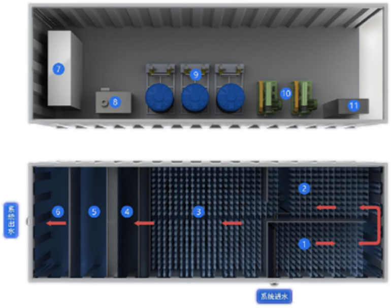 是一种新型高效往复式生物电化学反应技术,主要采用折流往复式厌氧和缺氧、高效反应澄清区等技术组成,无需传统二沉池,污泥浓度高达(6-10g/L),同时采用改性生物炭负载铁形成生物电化学系统,使生物阴极接受来自阳极的电子进行生物反硝化作用,实现高效脱氮除磷,高效去除有机污染物质,出水更优质稳定。