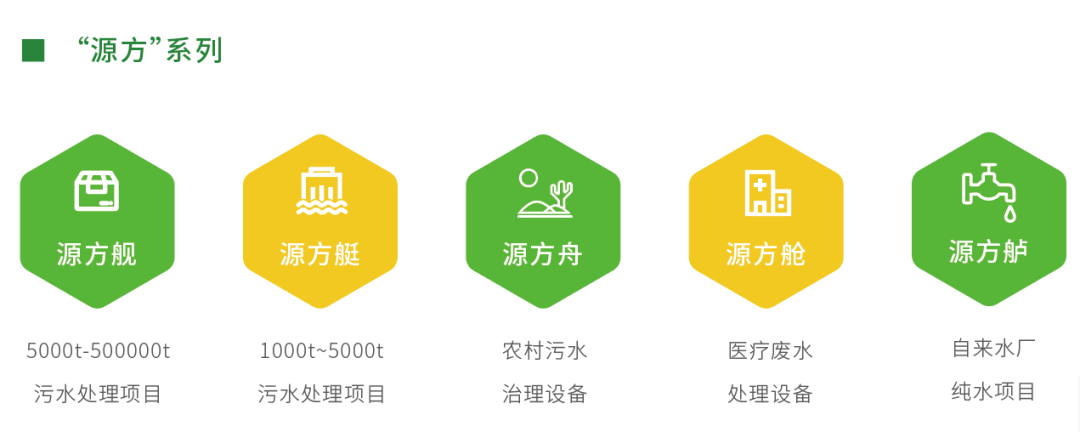 2015年在全球率先研发出装配式污水(净水)厂(TIMP智能模块化装配式集成污水处理系统),并推出源方系列产品,分别为:源方舰、源方艇、源方舟、源方舱、源方舻,实现了水质净化全领域的应用。