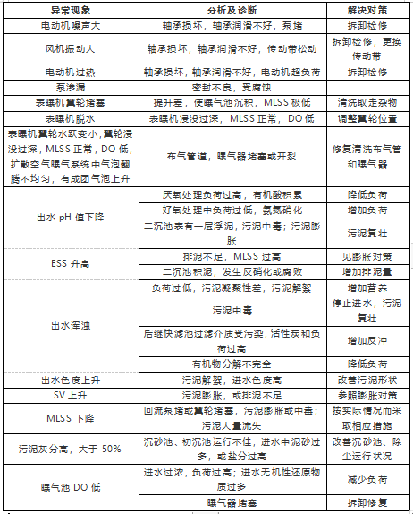 综合上述,在污泥发生膨胀时,应及时改变曝气池中微生物所处的环境条件,在有两大类微生物——菌胶团细菌和丝状菌共存并相互竞争的污泥体系中,创造适合于菌胶团细菌生长的环境条件,使丝状菌得不到优势生长,以达到改善污泥沉降压缩性能、控制或预防污泥膨胀的目的。下表为污泥性状异常及分析。